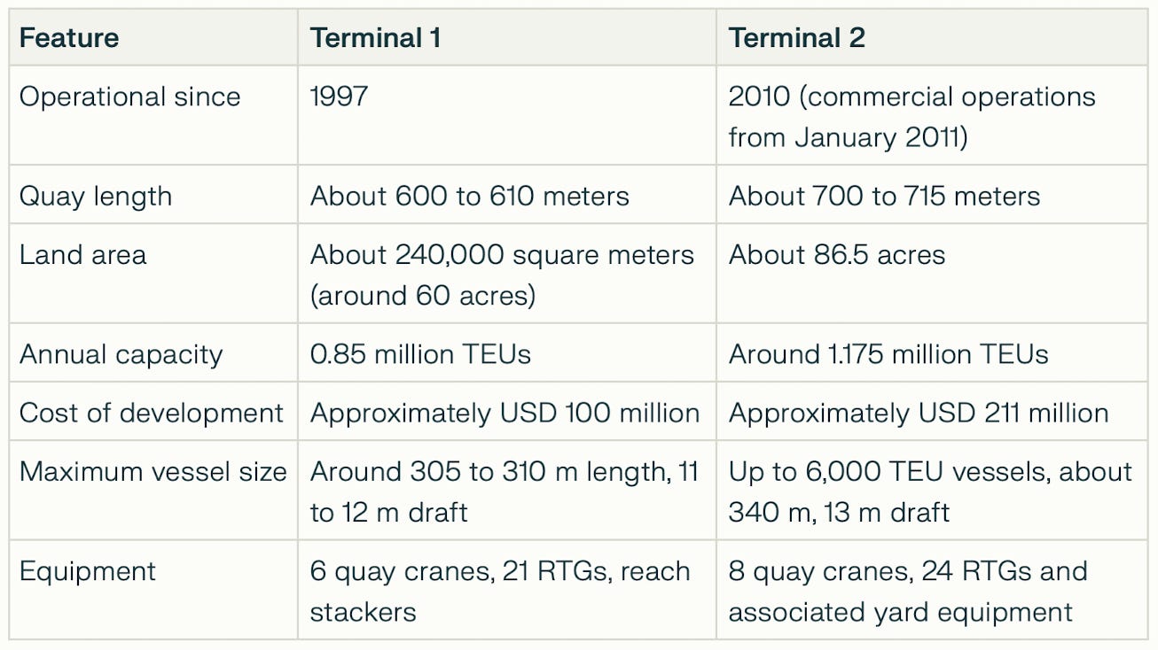 Under DP World’s stewardship, QICT has grown from a converted multipurpose facility into a high capacity container terminal complex. The first terminal was created by converting three existing multipurpose berths with a quay length of around 600 meters into a two berth container facility at an investment of roughly 100 million US dollars. A second terminal was added under a 2006 implementation agreement, at an estimated cost of about 211 million US dollars. Together, the two terminals provide design capacity of roughly 2 million TEUs per year, making QICT the largest container handling facility at Port Qasim.