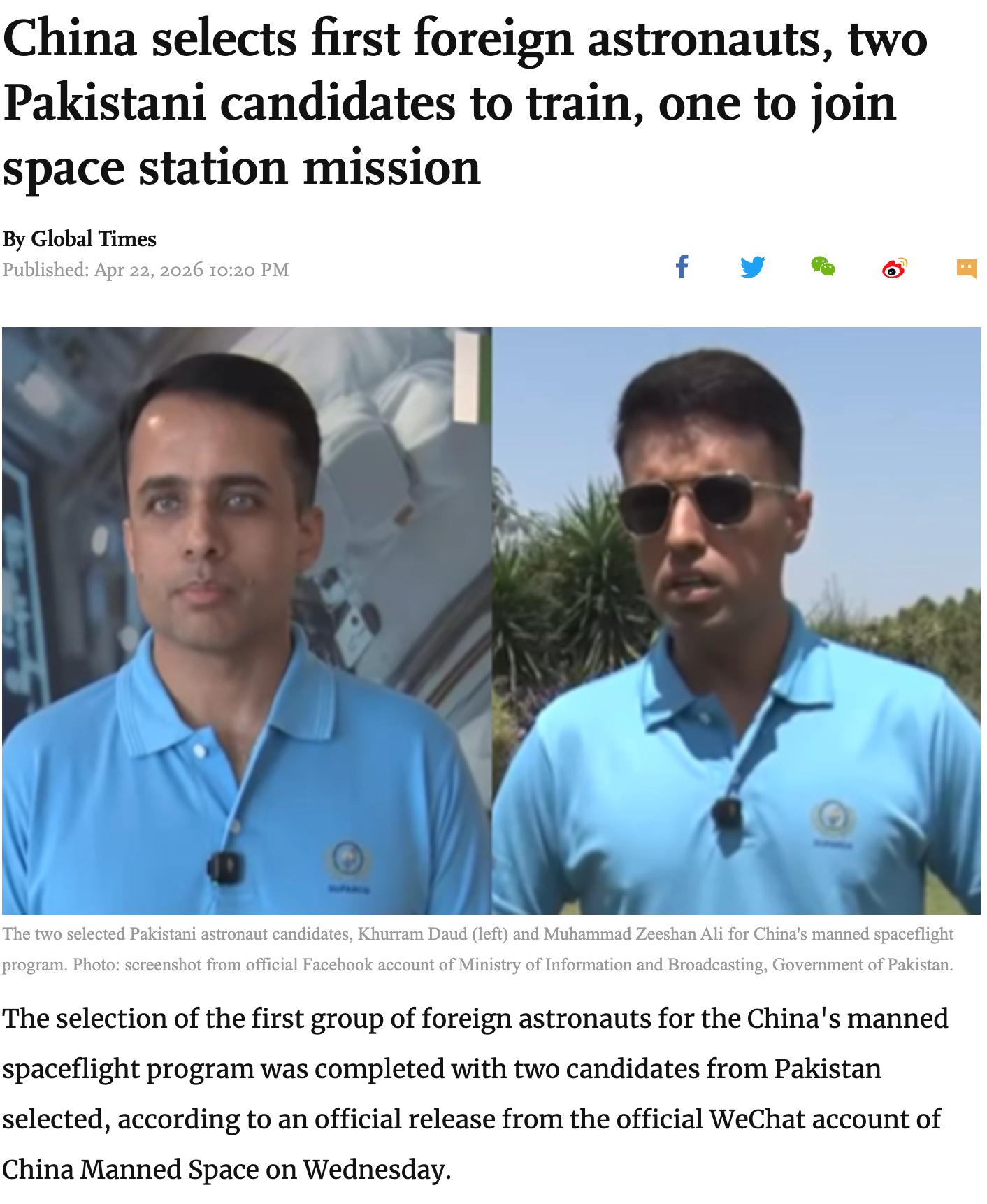 China’s Manned Space Agency announced on April 22, 2026, that Muhammad Zeeshan Ali and Khurram Daud had been selected as the first foreign astronaut candidates for its human spaceflight program. The two men cleared three stages of screening and evaluation, described in the official release as preliminary selection, secondary selection, and final selection, conducted at the Astronaut Center of China and assessed against international human spaceflight standards. After completing further training and evaluation at that center, one of them will fly to the Tiangong space station as a payload specialist, accompanying a Chinese crew. If this proceeds as described, that person will become the first foreign astronaut to board Tiangong, the station China completed in 2022 that orbits the Earth at approximately 400 kilometres. The mission is currently targeted for late 2026.
