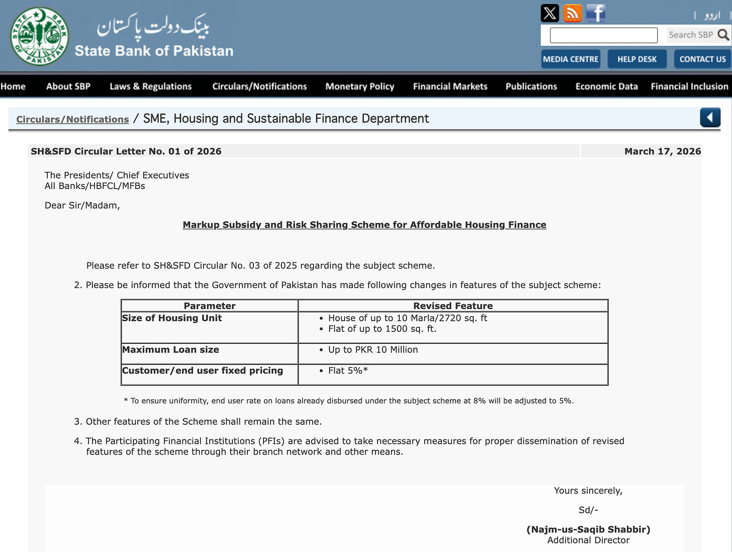 On March 17, 2026, the SBP’s SME, Housing and Sustainable Finance Department issued Circular Letter No. 01 of 2026. It revised the Markup Subsidy and Risk Sharing Scheme for Affordable Housing Finance. The customer-facing interest rate dropped to a flat 5 percent. The maximum eligible loan was capped at 10 million rupees, for a house of up to 10 Marla or a flat of up to 1,500 square feet. All bank presidents and chief executives were instructed to disseminate the revised features through their branch networks and other means.